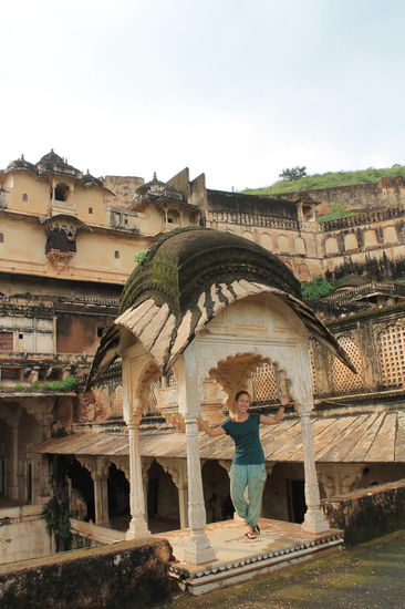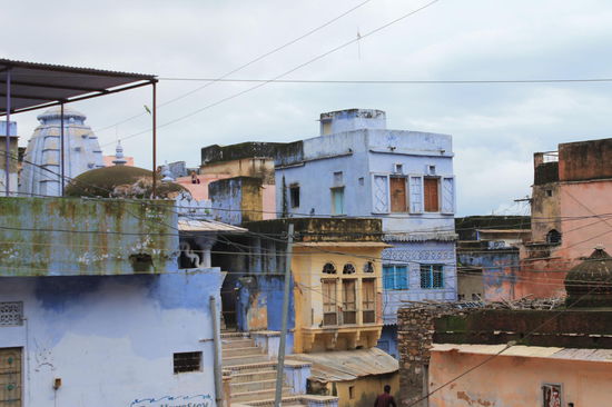 Weil uns Bundis entspannte Kleinstadt-Atmosphaere mit den gruenen Bergen, die die Stadt und den See umgeben haben, als auch unser Zimmer so gut gefallen haben, haben wir beschlossen einen Tag laenger zu bleiben. Wir haben uns den schon sehr verfallenen Palast angeschaut, bei dem grosse Teile leider nicht mehr zugaenglich sind. Im oberen Stockwerk, vor allem in dem Bereich in dem damals die Frauen des Maharaja gelebt haben, sind beeindruckende tuerkise und goldene Wandmalereien, deren Farbe leider zunehmend verblasst. Von den Balkonen des Palasts hat man einen wunderschoenen Ausblick auf die Stadt mit den blauen Haeusern.