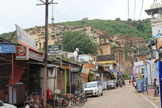 Von Udaipur aus sind wir mit dem Zug – dieses Mal mit der guenstigen Sleeperclass (3 Betten uebereinander mit offenen Fenstern) – Richtung Bundi gefahren. Bundi ist ein kleiner nicht all zu touristischer Ort. Als wir nachts um 23 Uhr angekommen sind, musste unser Tuktuk Slalom zwischen den 100ten Kuehen und Hunden fahren die ueberall auf den Strassen lagen und geschlafen haben. Die Hauptbazarstrasse, durch die wir zu unserem Hostel gefahren sind, war komplett ueberflutet und glich einem Fluss, weil der See komplett voll war, da es die letzten 15 Tage nur geregnet hatte. Deswegen wurden erhebliche Mengen an Wasser aus dem See abgelassen und die Strasse hinab geleitet.