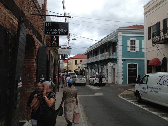 Nach viel zu kurzem Aufenthalt kehren wir ins touristische Stadtzentrum von Charlotte Amalie zurück. In den kleinen Gassen gibt es eine Vielzahl von Schmuck und Luxusgeschäften und man sagt uns, dass es günstiger sei als in den USA , doch da wir noch den Eintritt in Disney World zahlen müssen gibt es dieses Jahr mal eben keine Rolex ...