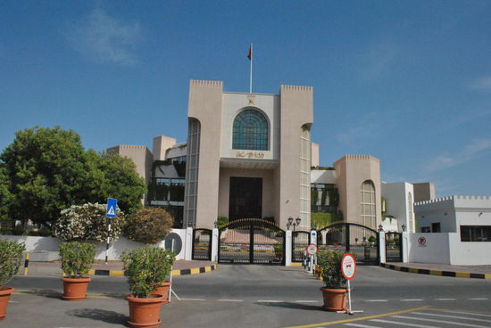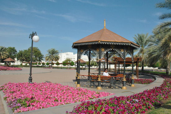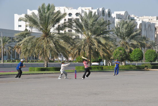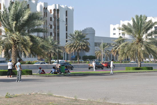 Zwischen Highway und den Ministerien befindet sich ein sehr gepflegter Grünstreifen - fast wie ein kleiner Park. Heute ist Freitag - Freitag/Samstag ist das Wochenende der Omani. Offensichtlich nutzen sie die Vormittagsstunden, wo die Hitze noch nicht so groß ist, für sportliche, gesellige Aktivitäten: Wir sehen einigen bei einem Spiel zu, das ähnlich Baseball zu funktionieren scheint. Die Aufteilung des Spielfeldes amüsiert uns: auf der einen Seite endet das Spielfeld an einem Gebäude mit einer hohen Mauer, auf der anderen am Highway. Sie spielen mit Bällen, die aussehen wie Tennisbälle und mehr als einer landet über der Mauer bzw. auf dem Highway ...