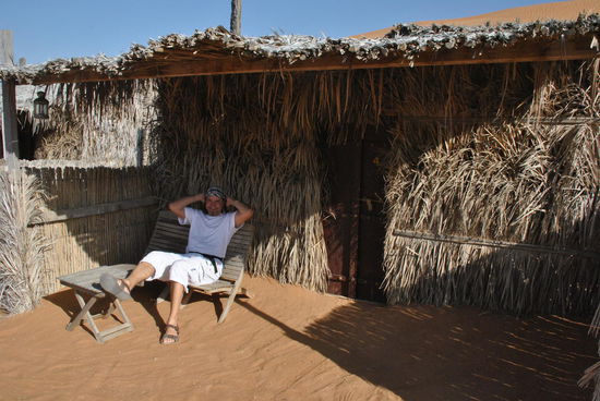 Getränke gibt es hier so viel man möchte: Tee, Kaffee (zwar löslich, aber um Längen besser als im Turtle Beach Resort), Wasser und ein Wasser, in dem Minzeblätter, Apfelscheiben, Zitronenscheiben u.m. schwimmen - Abdallah nennt es "desert-wine", wunderbar erfrischend. Wir bekommen unsere Basrasti (Hütten) zugewiesen. Erstaunlich, wie wenig ein Mensch eigentlich braucht: ein Bett, ein kleines Schränkchen zum Ablegen des Gepäcks - wir haben nur einen Trolley mitgenommen, der andere ist im Auto geblieben - , und ein paar verbogene Bügel die irgendwie zwischen den Bastmatten klemmen.