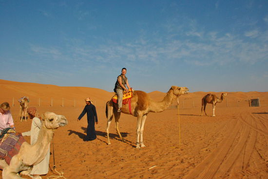Dann geht es auf zu einem kleinen Ausritt auf den "Wüstenschiffen". Anfänglich sehr komisch: da die Tiere aneinander gebunden sind, taucht ständig ein Kamelkopf neben dem rechten oder linken Oberschenkel auf...Manchmal sind sie mir sogar so nahe, dass es kurz vor "Bussi geben" ist. Meine Morgengymnastik beinhaltet nun Gleichgewichtsübungen auf dem schwankenden Tier mit gleichzeitigem Ausbalancieren von Fotoapparat und Action-Cam. Der kleine Ausritt dauert ca. 30 Minuten.