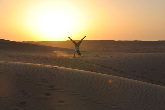 Es lohnt sich: wunderschöne Farben, nochmal eine herrliche Aussicht über die unendlich anmutende Weite der Sanddünen, ein paar Tässchen Kaffee in der Dämmerung und dann ein "downhill-run" ....jipiiiiiiiiieh, hier kommt auch das Kind in der Frau hoch und die steile Düne, die mich einen 5-Minuten-Aufstieg gekostet hat, ist in 30 Sekunden "im Flug" bewältigt.
