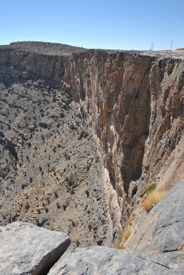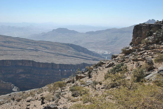 An einem Haltepunkt steht ein Omani mit seinem Jeep und fragt uns, ob wir zum Jebel Shams wollen. Dann sagt er uns, dass die Straße nicht komplett geteert ist, sondern einige Kilometer Schotter und bietet uns einen "Taxi-Dienst" an. Ich frage nach dem Preis, kann ihn von 25 OR auf 22 runterhandeln. Wir finden zwar, dass das viel Geld ist für ca. 30 km - aber, diesen "omanischen Grand Canyon" wollen wir uns nicht entgehen lassen. Im Nachhinein bereuen wir keinen Rial: unser Fahrer ist - wie viele Einheimische hier - sehr nett, beantwortet so gut er kann viele Fragen und stellt auch selber viele. Das fällt auf: die Omani sind sehr wissbegierig: "Wie viel kostet Benzin in D?" "Wie viel kostet ein Essen im Restaurant in D?" "Gibt es in D auch unbefestigte Straßen?" "Gibt es in D auch Gebirge, wie hoch sind die?" u.v.m.