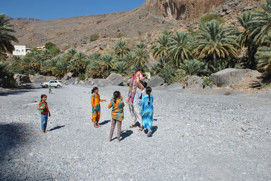 Nun fahren wir wieder etwas abwärts Richtung Al Hamra und halten unterwegs noch bei einem kleineren Dorf - wir wissen bis jetzt nicht wie es heißt, wir haben weder ein Schild gesehen, noch konnten wir es auf der Karte zuordnen. Wir laufen ein Stück in ein Wadi hinein, sehen ein paar Gärten mit diesem alten Bewässerungssystem und werden auf einmal von ein paar Kindern umringt, die uns unbedingt Armbändchen verkaufen wollen. Obwohl es derartige Bändchen bei NANU NANA und Co. in D wohl billiger gibt, kaufen wir einem Mädel eins ab für 1 OR. Wärend sie versucht, Frank das Band um sein Handgelenk zu binden, singt ein anderes Mädchen und tanzt ein wenig. Spontan mache ich mit, d. h. ich versuche ihre arabischen Worte und die Melodie aufzunehmen und ihre Tanzbewegungen mitzumachen. Auf einmal stehen die Mädels alle um mich herum, lachen und jede macht irgendetwas vor, das ich dann nachmachen soll. Frank schaut zunächst etwas irritiert, denn greift er zur Kamera - das erspart ihm auf jeden Fall ein Mitmachen bei diesem ungeplanten Tanz-Gesangs-Crash-Kurs im Wadi. Bestimmt 10 Minuten tanzen und singen wir auf dem steinigen Untergrund, dann umarme ich meine kleine Tanzlehrerin und bedanke mich. Jetzt geht es aber richtig los: jede will umarmt und mal hochgehoben werden und eine kleine Lady hört gar nicht auf, mir Bussis zu geben. Es hilft nichts, wir müssen weiter - und ein paar weitere Touristen erweisen sich als hilfreich, denn den Mädels fällt ihr "Geschäft" wieder ein und sie stürzen sich auf die neuen potentiellen Kunden.