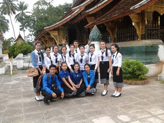Beim vat treffen wir eine laotische klasse mit ihrem lehrerstudenten.