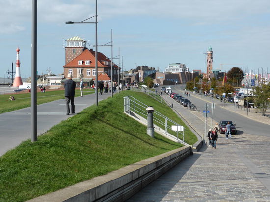 Über die Kommodore-Ziegenbein-Promenade laufen wir nordostwärts auf ein Ensemble ultramoderner Bauwerke zu.