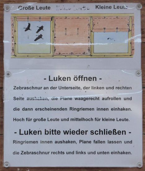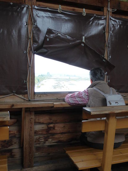 Am Ende des Pfades steht ein Beobachtungsturm, dessen Öffnungen allesamt mit Planen verschlossen sind.