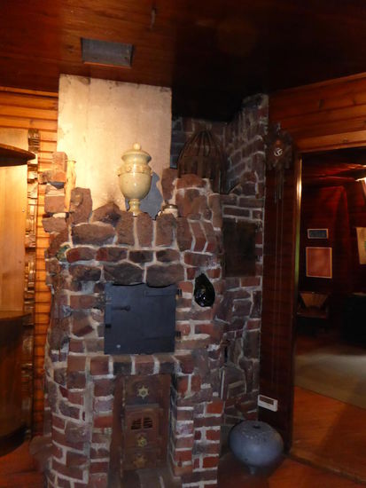 Prunkstück des Hauses ist der expressionistische Ofen im Erdgeschoss. Mit seiner Originalität - auch im Material - und seiner Liebe zum Detail fasst er die Seele der Käseglocke zusammen: im Jahre 1926 hochmodern in seinen Formen und Ideen, architektonisch vollkommen auf der Höhe seiner Zeit, gleichzeitig aber sehr, sehr gemütlich. Auf der einen Seite des Ofens findet man eine Nische, in die man vom Schaukelstuhl aus seine Füße zum Aufwärmen hineinstecken kann, auf der anderen Seite des Ofens ist eine ähnliche Nische. Die ist für die Katze.