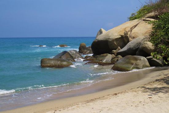 Die Aussicht ist schön, aber haut mich ehrlich gesagt nicht wirklich um. Ich bin mit meinen Gedanken leider auch schon ein wenig auf der Heimreise und war und bin einfach nicht soooo der Strandmensch. Wenn ich nicht laufen kann, wird mir dann gleich mal langweilig. Allerdings wird mir die Entscheidung, ob ich doch noch zur nächsten Bucht laufen soll, vom Wetter abgenommen. Schwarze Gewitterwolken ziehen auf und so verbringe ich nur ca. 6 Stunden im Park. Ach was soll´s. Es ist wieder so schwül und heiß, dass einem das Wasser einfach nur aus allen Poren läuft. Somit entscheide ich mich den Rückweg nach Santa Marta anzutreten.