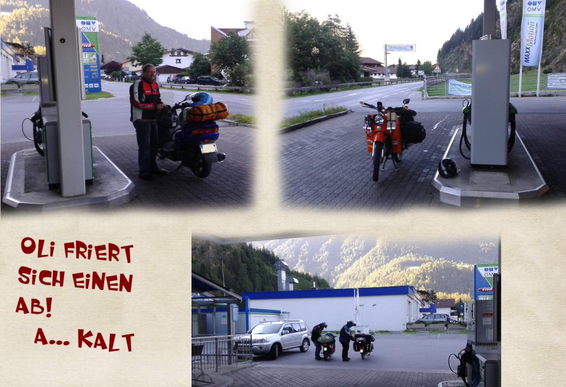 Nachdem wir ja nun "was großes" (das Timmelsjoch) vor der Brust hatten und ich auf der Tankanzeige meiner Schwalbe "Die Ebbe" kommen sah, gab ich Gas um als Letzter, an allen vorbei zu Oli vor zu stoßen.