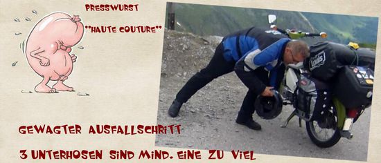 Es ist immer das Gleiche. Ab einer gewissen Anzahl von Unterhosen und Pullovern spannt jede Bikerkluft. Ich komm oft nicht einmal an meine Schuhe zum Schnürsenkel binden! Dieses mal waren die ja mit Panzertape fixiert!