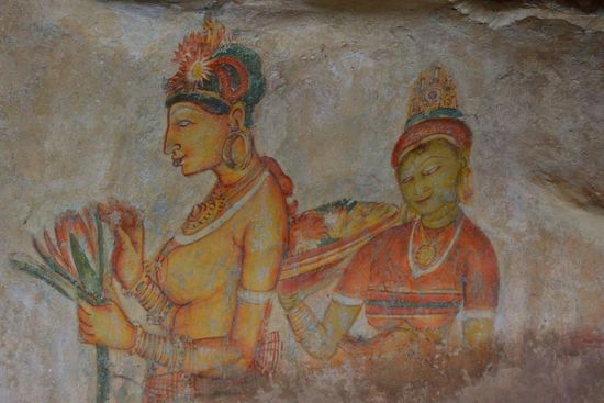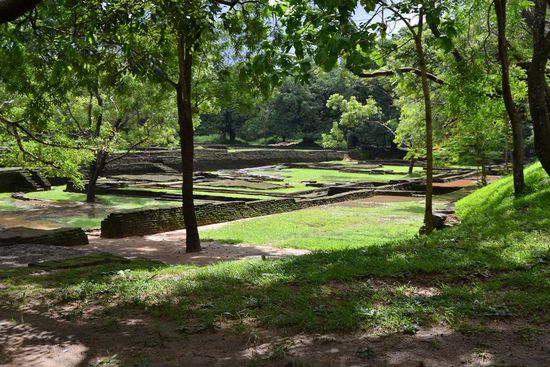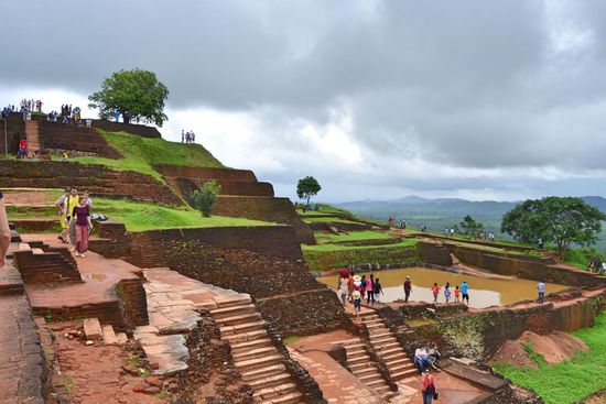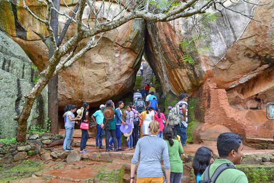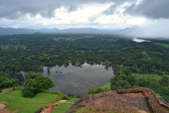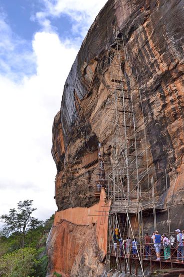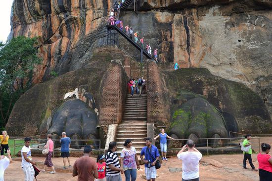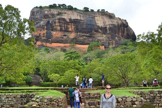 Nach 3 Stunden Fahrt und einem deftigen Frühstück mit Chicken -und Fishcurry, kamen wir noch bei trockenem Wetter an diesem beeindruckenden, über 200 m hohen Monolithfelsen an. Für einen unverschämten Eintritt von 30 $ pro Person durften wir auch noch zu Fuß die Treppen zu den oben aufliegenden Ruinen steigen.
