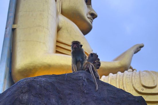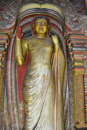 Da die Muskeln noch warm waren vom Aufstieg des Monolithen, flogen wir die zahlreichen Stufen zu den Höhentempeln geradezu hoch. Oben angekommen hieß es Schuhe ausziehen und gegen eine kleine Spende in Obhut geben. Es regnete übrigens schon wieder ausgiebig, aber das konnte uns in den Höhlen ja egal sein.