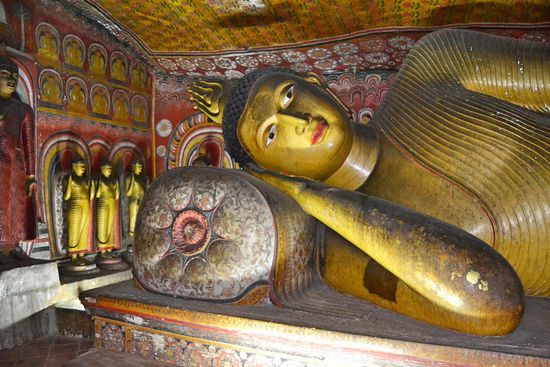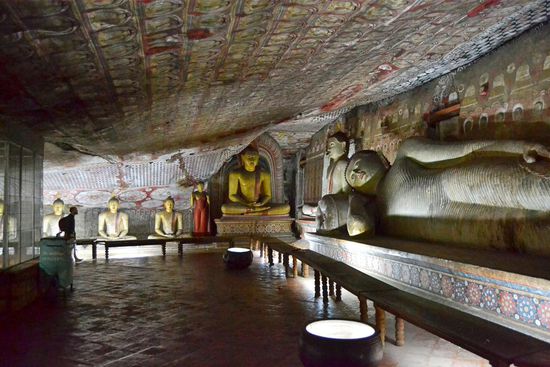 Wir machten uns also auf den Weg nach Dambulla. Zu verfehlen war die Tempelanlage nicht, grinste uns am Eingang doch ein riesiges löwenähnliches Maul mit unzähligen goldenen Zähnen an. Man hätte auch im Phantasialand sein können. Der Eintritt von umgerechnet ca. 9 $ kam uns nun schon fast geschenkt vor.