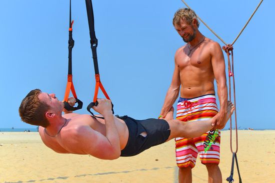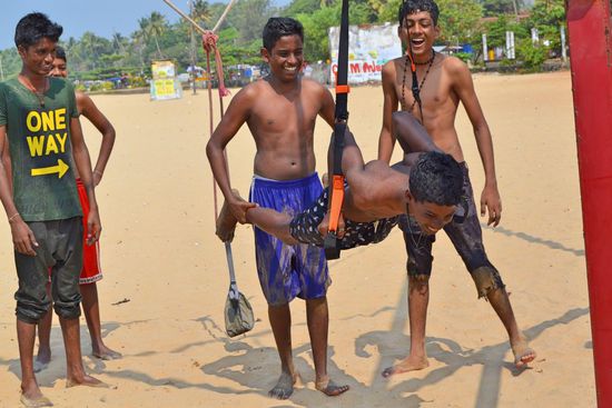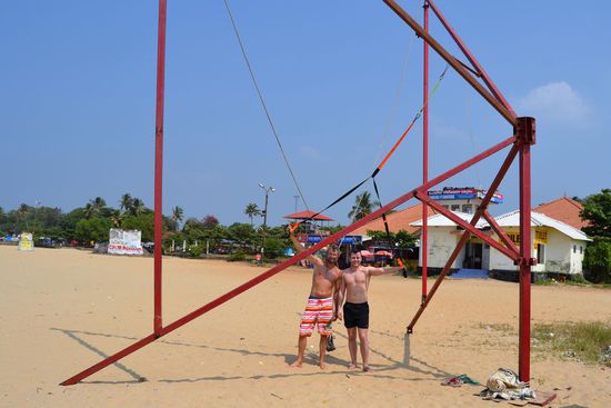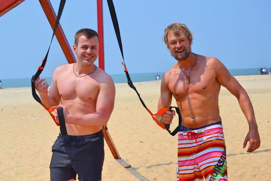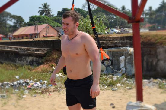 Nach unserem Frühstück, war der erste Weg, zum Strand zum Training. Leider mussten wir die von Daniel mitgebrachten Schlingen statt an Palmen (die gab es hier leider nicht am Strand), an ein verrottendes Metalkonstrukt hängen. Die in der Nähe befindlichen Jugendlichen bestaunten den Aufbau unseres mobilen Gyms schon aus der Ferne interessiert. Als es bei uns mit dem Training los ging, verloren sie jegliche Scheu und kamen zusammen um selbst mal zu testen, was die verrückten Deutschen hier am Strand veranstalten. Es war zu lustig als die Jungs da versuchten zu trainieren, und da sie gegenüber uns einen 20 Jahre Trainingsrückstand hatten, waren sie alle nach wenigen Minuten platt und gingen von dannen.