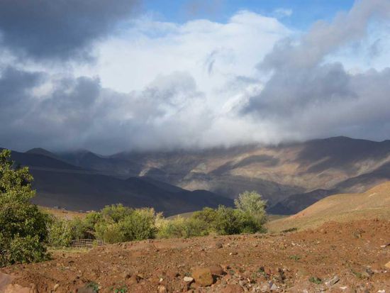 Die Landschaft unterwegs unglaublich schön. Es geht, was manche ja nicht so mögen(grins), eigentlich über Stunden nur in Serpentien den Hohen Atlas hinauf auf den Tizi-n-Tichka Pass auf 2260 Meter. Da oben war es einfach saukalt und ganz schön windig. Also haben wir nur ein kurzes Foto geschossen und schon ging es weiter. Kurz hinter dem Pass kann man dann Richtung Telouet abbiegen. Vom Andi, von der Unterkunft hier, haben wir erfahren, dass wir diese Strecke nur nehmen sollten, wenn es weder