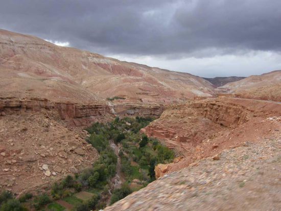 getankt haben. Für 500 Dirham ...also ungefähr 50 Euro. Weitere 10 km weiter gab es plötzlich und unerwartet ein ziemlich eigenartiges Geräusch. Also kurz angehalten, dass Auto böse angeschaut und weiter gefahren. Allerdings hat uns dieses Geräusch, ich vermute mal ein mittleres Getriebeproblem, noch eine ziemlich weile verfolgt. Mal schauen, wann das Vehikel zusammenbricht. Wie auch immer, die Tour war geplant und wir wollten auch endlich raus aus der Stadt. Wir waren auf dem Weg nach Aid Benhaddou. Ca 200 km ... nichts besonderes. Eine Unterkunft hatten wir gebucht, die Idee dazu haben wir von Kerstin aus dem Losra erhalten.