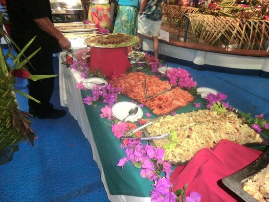 Heute Abend ist "polynesische Nacht" auf der Aranui. Die Küchenmannschaft übertrifft sich bei der Einrichtung des Buffets, es gibt schlicht alles was die Region zu bieten hat. Aussergewöhnlich vor allem das Dessertbuffet mit verschiedensten Süssspeisen, Torten und superzarten Macarons!