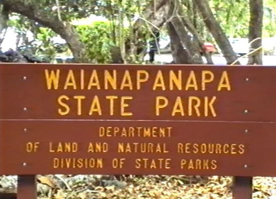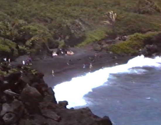 Mit Wadenwickel und zwei Aspirin am Morgen bin ich wieder fit. Aber Ulrike hat natürlich diese Nacht mit gelitten und wenig geschlafen, da ich wieder unruhig war. Heute steht dann die für gestern geplante Hana Tour mit langer Fahrstrecke an. Um 9.00 Uhr kommen wir nach Zimmerbreakfast los. Die Kreuzfahrer kommen zwar von Bord, aber auch im Laufe des Tages hören wir nichts von Bernd und Bärbel, obwohl Ulirke eine Nachricht an Bord gegeben hat. Nach ca. einer Stunde Fahrt geht die Kurverei los. Endlose Kurven durch dschungelartige Küstenlandschaft, die jedem noch so kleinen Rinnsal folgt. Einige nicht sonderlich spektakuläre Wasserfälle sind schon überlaufen. Wegen des Schlafmangels, und auch so, sind wir sauer, werden jedoch am ersten richtigen Stop im Waianapanapa-State-Park voll entschädigt.
