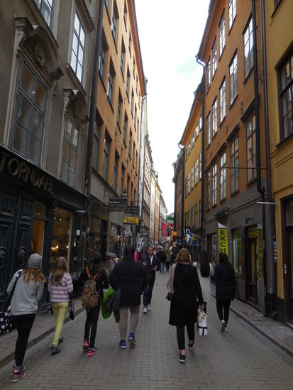 Jetzt aber nichts, wie los ! Es ist ja schon nachmittags und ich mache mich als erstes auf kurze Erledigungstour in der unmittelbaren Hotelumgebung, denn auf gar keinen Fall werde ich im teuren Schweden in einem Restaurant essen gehen, sondern stattdessen auf Self-Catering und Fastfood setzen. Wobei: Eine Portion IKEA-Köttbullar wäre natürlich sehr geil, aber auch in Stockholm befindet sich IKEA natürlich nicht in der Innenstadt. Also besorge ich in einem nahegelegenen ICA-Supermarkt Schwarzbrot, Käse, Tomaten, Wasser, Softdrinks und Obst. Das lade ich alles schnell wieder im Hotel ab und begebe mich dann per pedes auf den Weg in die Altstadt von Stockholm - Gamla Stan. Ich komme unterwegs am Bahnhof vorbei und beschließe, mir für morgen sicherheitshalber ein Tagesticket für den Stockholmer ÖPNV zu besorgen in der dortigen Tourist-Info. Irgendwas ist komisch am Stockholmer Hauptbahnhof, die Menschen sitzen zuhauf draußen vor der Tür auf Bänken und sehen genervt aus. Drinnen stehen unzählige Reisende vor der großen Anzeigetafel und schütteln verzweifelt den Kopf. Keine Ahnung, was das Problem hier gerade zu sein scheint, ich gehe zur Tourist-Info und da ich ja am äußersten nördlichen Ende Deutschlands lebe, bin ich zwar des Schwedischen nicht mächtig (sondern nur rudimentär des Dänischen), aber die schwedische Standard-Begrüßungsfloskel ist mir sehr geläufig: Hej, hej ! Auf dänisch hätte ich den nächsten Satz auch noch herauswürgen können, aber auf schwedisch...nej. "Can i get a map of Stockholm and a day-ticket for the public transport, please ?" Die junge, natürlich hellblonde Schwedin, grinst mich an und sagt "sure ! I am so happy, to meet someone, who wants something else, than train Information" "Why ? What´s going on here ?" "Swedish rail is on strike". Oh, shit. Aber das kennen wir ja auch zur Genüge von der DB, gut zu wissen, dass es woanders auch nicht besser ist. Ich erhalte meinen Stadtplan kostenlos, dazu sehr nette Erklärungen, ohne überhaupt danach gefragt zu haben. Für ich-weiß-nicht-mehr-wieviele-SEK bekomme ich das ÖPNV-Ticket hinzu und die junge Dame fragt mich noch, ob sie mir sonst noch helfen könne, was ich vorhabe, ob sie irgendwelche reservations oder bookings für mich erledigen solle. Ich bin beeindruckt ! So eine erstklassige Tourist-Info mit soviel Engagement habe ich in meinem ganzen Leben noch nie irgendwo gefunden. Und ich nutze die Situation, da ich tatsächlich eine Frage habe: "How about the City hall tour ? Do you think, there is a chance to get on a tour today ? And can i buy the ticket for it right here ?" Die hellblonde Vorzeige-Schwedin schüttelt bedauernd den Kopf, nej, für heute sei es zu spät, und die Tickets seien auch nur direkt in der City hall zu kaufen, außerdem sind sie hier noch immer im Winter-Modus und die City-hall-Touren werden nur bis max. 14.00 Uhr angeboten. Okay, dann eben morgen. Hoffentlich.