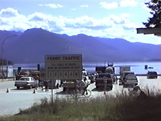 Über Cranbrook hinter Creston wollen wir den Kootenay-See entlang nach Norden. Doch da fahren lauter willebies; erst wenige Kilometer vor Crawford Bay bleiben drei Autos europäischen Fahrstils übrig. Auf die Fähre müssen wir 1,5 Stunden warten, da diese nur 35 Autos faßt und wir etwa in 55. Position stehen.