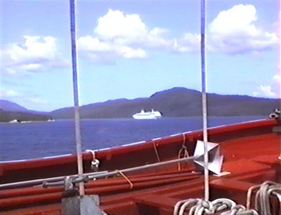 Gegen 13.00 Uhr passieren wir Bella Bella, den einzigen größeren Ort auf der fast 500km langen Strecke. Kurz hinter Bella Bella ist nochmals ein Stück offene See und prompt erscheinen wieder ganz tiefe Nebelbänke und versperren uns für ca. eine Stunde die Sicht.