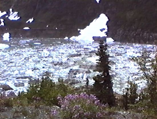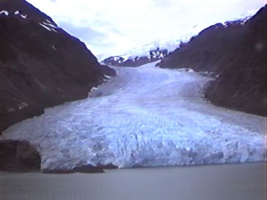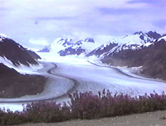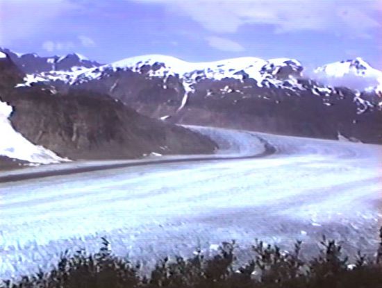 25 Meilen geht es aufwärts auf einer breiten Staubstraße bis zum riesigen Salmon Glacier. (Eigentlich sind schon wieder in Canada (keine Grenzstation da Sackgasse). Auf dem Summit gibt es ein 'üppiges' Mittagsmahl - jeder eine Joghurt bei um die Ecke kommendem Wind.