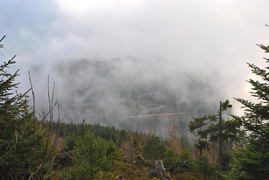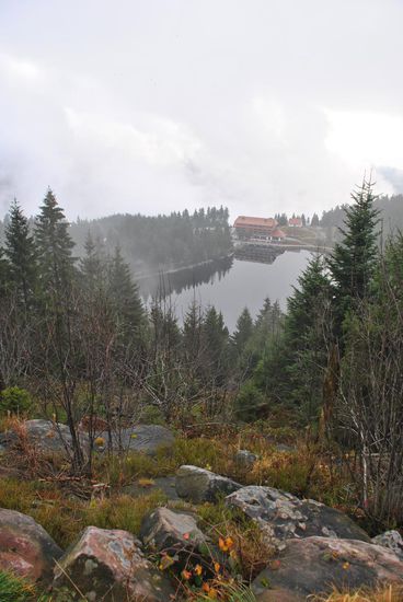Mein erstes Ziel soll der Schwarzenbach-Stausee sein. Nach kurzer Zeit wird es immer nebeliger. Ich hänge mich an die Rücklichter eines großen Holztransporters und bedauere als er abbiegt, denn jetzt sehe ich gar nichts mehr. Sehr überraschend taucht auf einmal die Staumauer wie aus dem Nichts auf... nun sieht man zwar etwas mehr, dafür regnet es jetzt in Strömen. Das lädt nicht wirklich zu einem Spaziergang ein, zumal meine Kamera ja keine Unterwasserkamera ist.