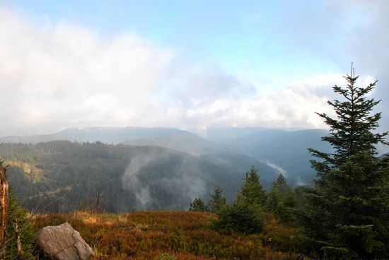 Ich möchte unbedingt noch ein wenig laufen und frage in dem großen Souvenirshop, wie der Weg zur Hornisgrinde ist. Der junge Mann ist super freundlich. Er fragt: " laufen Sie gerne?". Als ich mit JA antworte beugt er sich über seine Theke und schaut an mir herunter. Ich bin etwas irritiert, bis er sagt: "Ah, o.k. die Schuhe sind in Ordnung!" Ich bin überrascht, wie weit der junge Mann mitdenkt. Dass sein Kontroll-Blick durchaus seine Berechtigung hat, wird mir schnell bewusst, als ich losmarschiere.