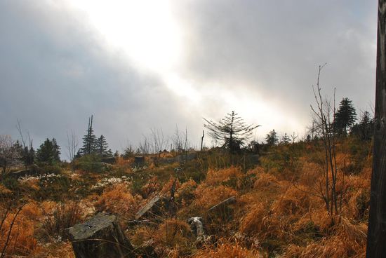 Kurz bevor ich oben bin, sehe ich einen Hang, auf dem nur noch Baumstummel vorhanden sind, jedoch von unten die Natur für wunderbares neues Pflanzenleben gesorgt hat.