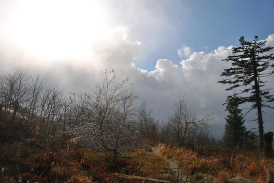 Zunächst geht es nach oben und endlich: ab und zu lichten sich die Nebel - es sind nur noch Fetzen - immer wieder versucht die Sonne, einen Weg hindurch zu finden. Dies verursacht wunderbare ständig wechselnde Stimmungen. Ich bin begeistert und inzwischen sehr glücklich über dieses Wetter - denn ein weiterer Nebeneffekt ist, dass mir auf der gesamten Wanderung KEIN MENSCH begegnet.