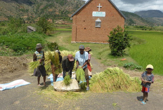 Auch können wir beobachten, wie der Reis per Hand gedroschen wird. An der Reismühle liegt ein großer Berg Reisschalen.