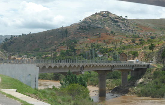 Wenige Kilometer weiter geht es durch kahles Bergland - der Fluß führt reichlich Wasser. 26 km vor Ambositra wurde eine mächtige Brücke gebaut, da die alte steinerne im Jahr 2002 bei politischen Unruhen infolge der Staatspräsidentenwahl gesprengt wurde; die Ruine ist noch zu sehen.