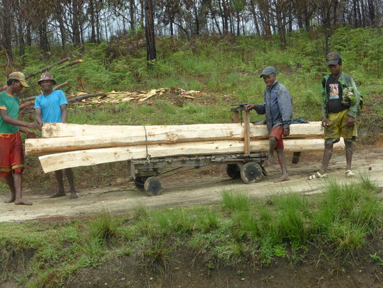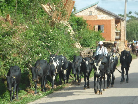 Gegen Mittag erreichen wir dann Ambositra ("ambousta" gesprochen) - ("dort, wo es viele Rinder gibt" oder auch "dort, wo es viele Eunuchen gibt") 20°33'08,6" S/ 47°14'53,1" O, 90 km südlich von Antsirabe. Dort besuchen wir eine Kunstwerkstatt für Holz. Vor dem Laden ist wie schon am Supermarkt, der Andrang auf uns Touristen recht groß. Überhaupt scheint mir auf dem Lande südlich von Tana die Bevölkerung - und vor allem die Kinder - aufdringlicher zu werden. Unsere Österreicher verteilen dazu völlig irrer Weise wieder einmal Bonbons. Wir finden eine zu unserer Äthiopienfigur passende aus Ebenholz und ein Zebu für Christas Zoo.