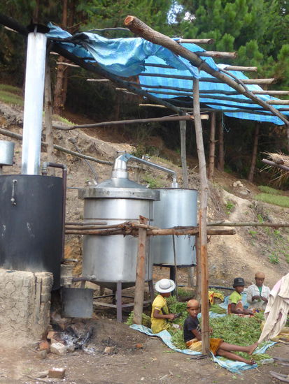 Trotz intensiver Recherche habe ich für Madagaskar nichts gefunden, was mehr Infos über die Destillation von Geraniumblättern bietet. Lediglich im benachbarten Reunion gibt es ein Maison du Geranium - aus dem Besuch dieser Seite läßt sich entnehmen, dass man mit dem gewonnenen Sirup Honig, Tee und auch Rum parfumiert.