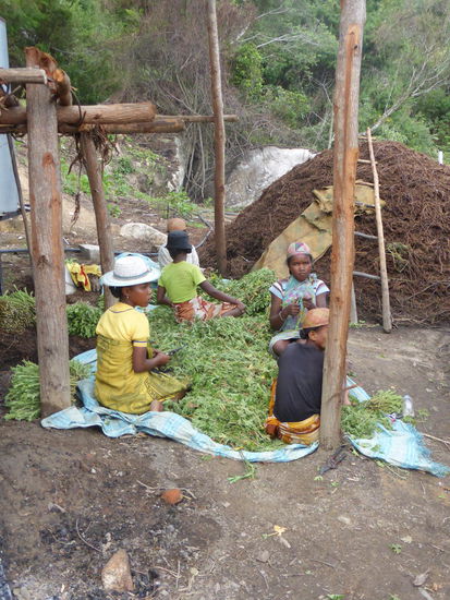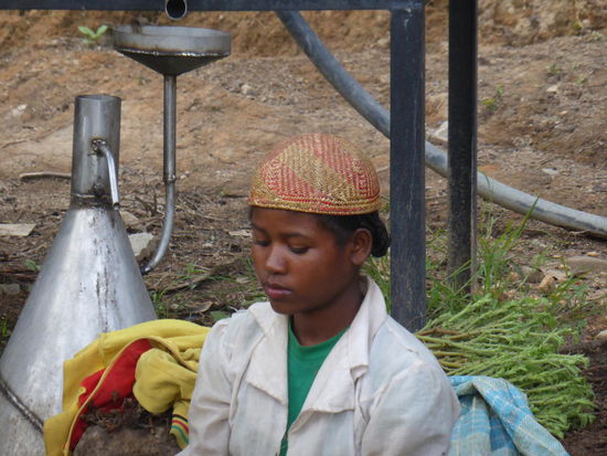 In der Gegend des Betsileostamms tragen die Frauen lustige 'Kompotthüte', auch die, die am Straßenrand eine Geraniumdestille betreiben.