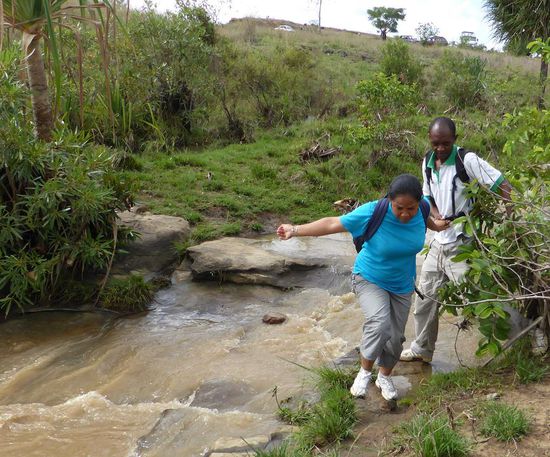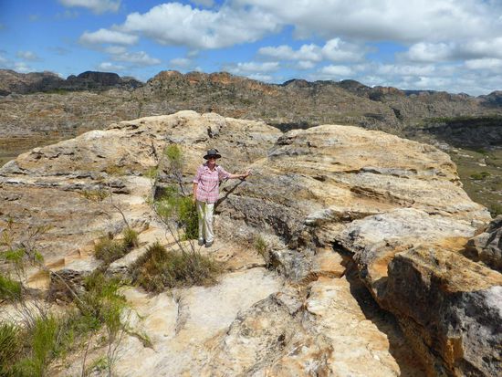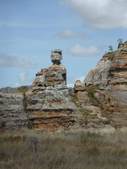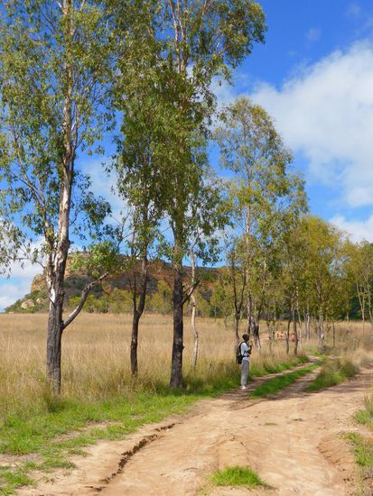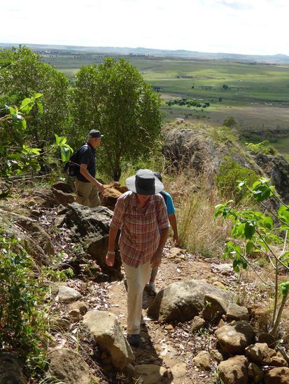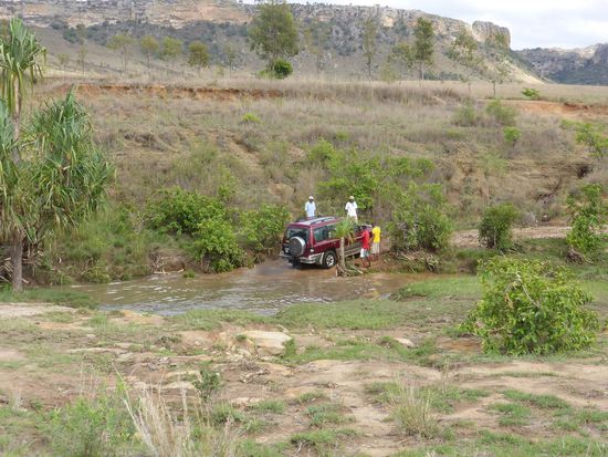 Wir kommen tatsächlich um 7.30 Uhr los, das macht Sinn, da es mitags bereits unerträglich heiß wird. Auf der Fahrt zum Startpunkt der Wanderung, der heute nahe der Hauptstraße liegen muß, da der zu durchfahrende Fluß wegen der gestrigen heftigen Regenfälle nur gerade noch für 4WD-Fahrzeuge passierbar ist. Auf der Hauptstraße können wir die Silhouette der Königin in Stein sehen und gelangen vorbei an einem typischen Dorf der Bara zum Abzweig.