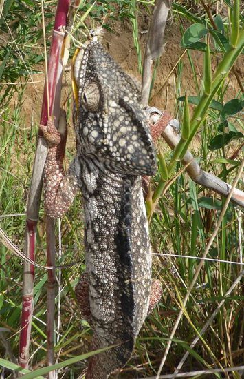Der obligatorische Guide findet natürlich im Gebüsch wieder sofort ein Chamäleon. Ich kann gerade noch mitbekommen wie eine 20cm lange Zunge wie der Blitz eine Heuschrecke fängt, die sofort im Maul verschwindet.