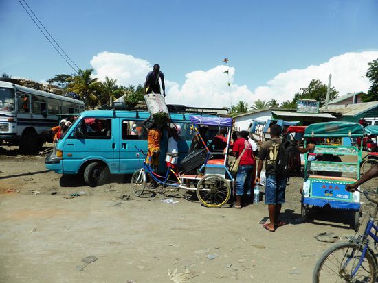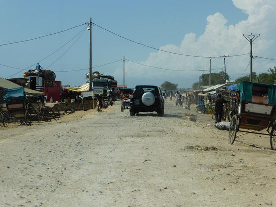 Sobald wir den Stadtbezuirk verlassen hört die Teerstraße auf. Die Küstenstraße nach Manombo ist zwar - wie Rina uns sagt - inzwischen als Sandpiste befestigt, verlangt aber den Reifen alles ab.