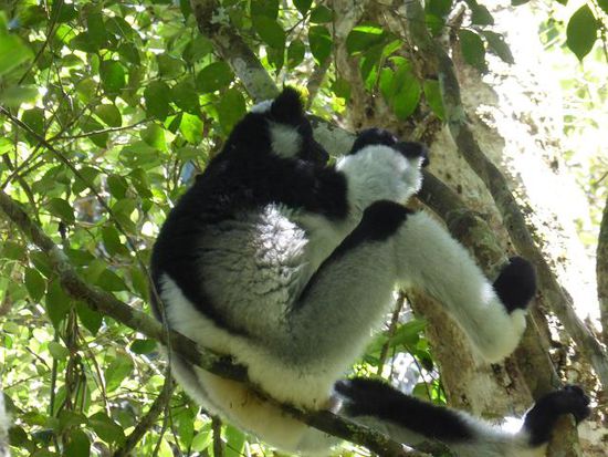 Nun sind schon eine gute Stunde unterwegs und noch keine Indri. Doch dann wird wird es laut - sie brüllen in der Nähe und informieren sich gegenseitig über ankommende Touristen! Wir schleichen über einen Nebenpfad steil bergab über einen bach und wieder steil bergauf. Und dann haben sie sich so hoch in die hohen Bäume verkrochen, dass die Kameras beim Scharfstellen streien - immer ist ein Ast oder Zweig davor.