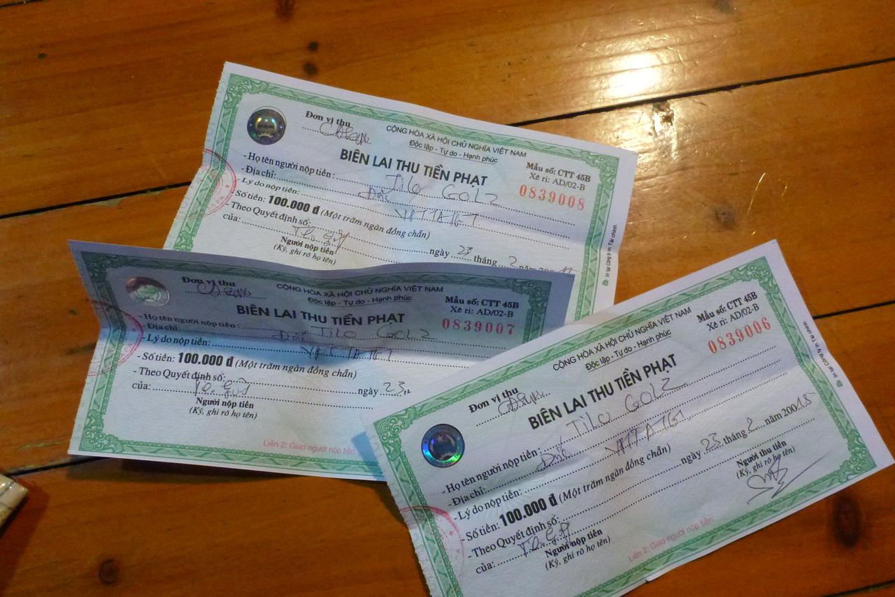 Tags darauf haben wir uns wieder Motorbikes ausgeliehen, um über Vietnams höchsten Pass Deo Tram Ton zu fahren. Auch hier mussten wir unzählige Stopps einlegen, um die gigantische Landschaft zu genießen. Auf der anderen Seite des Passes ging es dann so tief, dass die Reisfelder bereits grün waren. Von Phil bekamen wir eine Karte, die einen Rundkurs beschrieb, durch grüne Felder und kleine, abgeschiedene Dörfer, in denen die Kinder einen immer mit einem Winken und einem "Hello" begrüßten. Abgeschlossen haben wir die Motorbike Tour mit einem Strafzettel, da wir in einer Einbahnstraße gegen die Fahrtrichtung fuhren. Wohl wissend, dass man das nicht darf, aber das machte ja jeder