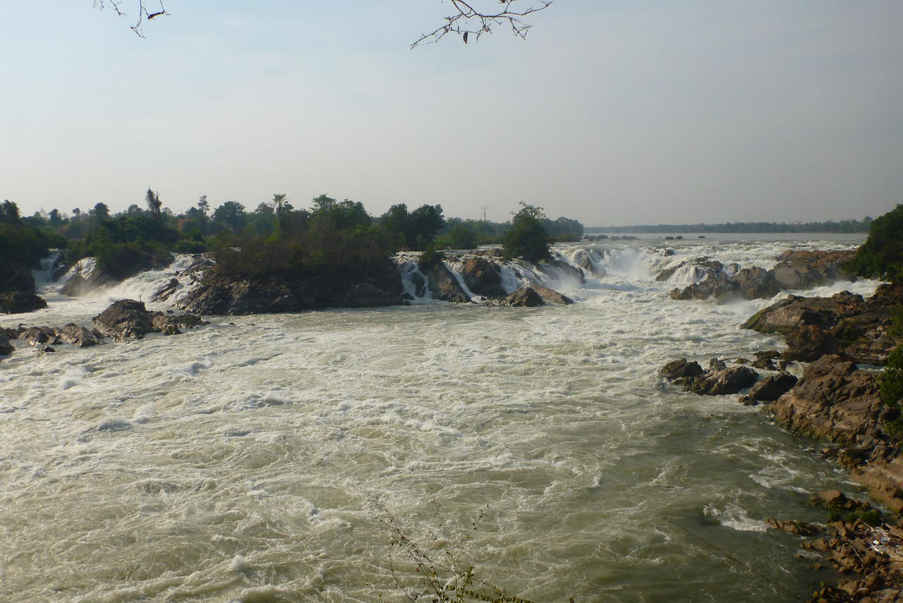 Doch am nächsten Tag war schon die nächste Aktivität geplant. Mit Romana und Barbara aus Zürich, die ich bei der Überfahrt kennen gelernt habe, machte ich eine geführte Kayaktour. Nachdem wir mit dem Kayak unseren Weg durch die Inseln fanden, vorbei an Fischern und Wasserbüffelherden (die sind doch überall ), ging es über Land zu einem kleinen, aber feinen Wasserfall. Weiter ging es zu einem Sandstrand, wo wir uns dann im Mekongwasser abkühlen konnten und etwas gegessen haben. Durch Stromschnellen, bei denen mehrere Boote, unter anderem auch unseres, kenterten, erreichten wir dann ein Becken, in dem sich Irawadi Delfine befinden. Diese Süßwasser-Delfinrasse ist vom aussterben bedroht. Im Mekong leben scheinbar nur noch 85 Exemplare...Man muss echt Glück haben die Tiere zu Gesicht zu bekommen. Doch nach einer Weile ausharren konnten wir in der Ferne immer wieder Delfine beim Luft schnappen beobachten. Weiter ging es dann zum Khon Phapheng Wasserfall, welcher der größte Wasserfall in SOA ist. Er bildet auch die natürliche Grenze zu Kambodscha. Abends sind wir mit dem Fahrrad nach Don Det geradelt. Die beiden Inseln sind durch eine Brücke verbunden. Doch die Insel wurde ihrem Ruf als Partyinsel nicht gerecht...auch hier gehen um 23 Uhr die Lichter aus