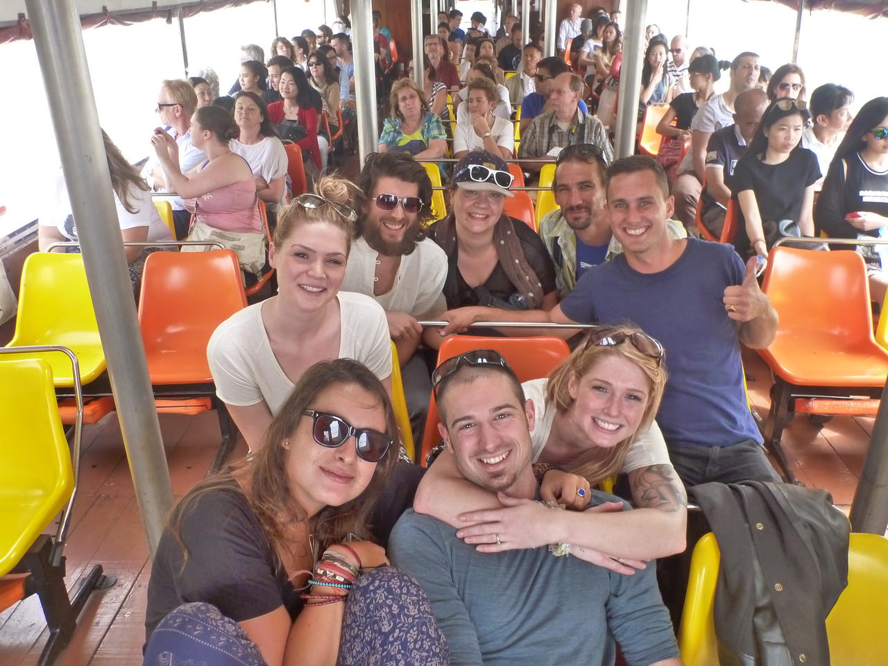 Tags darauf sind wir in ähnlicher Konstellation zum Königspalast, die ehemalige Residenz der Siam Könige. Um dorthin zu gelangen nahmen wir die Skytrain und den Wasserbus, von wo aus man schon viel von der Stadt sieht. Auf dem Gelände des Königspalast befinden sich unzählige Statuen, Pavillons, der Königstempel Wat Phra Keo und auch ein paar Parks. Sehr beeindruckend, wenn man überlegt, dass das alles von Hand und ohne Maschinen gebaut wurde. 500 Bath (umgerechnet ca. 12,50€) sind für thailändische Verhältnisse zwar recht teuer, aber es gehört halt zu den Dingen die man in Bangkok gesehen haben muss.