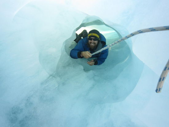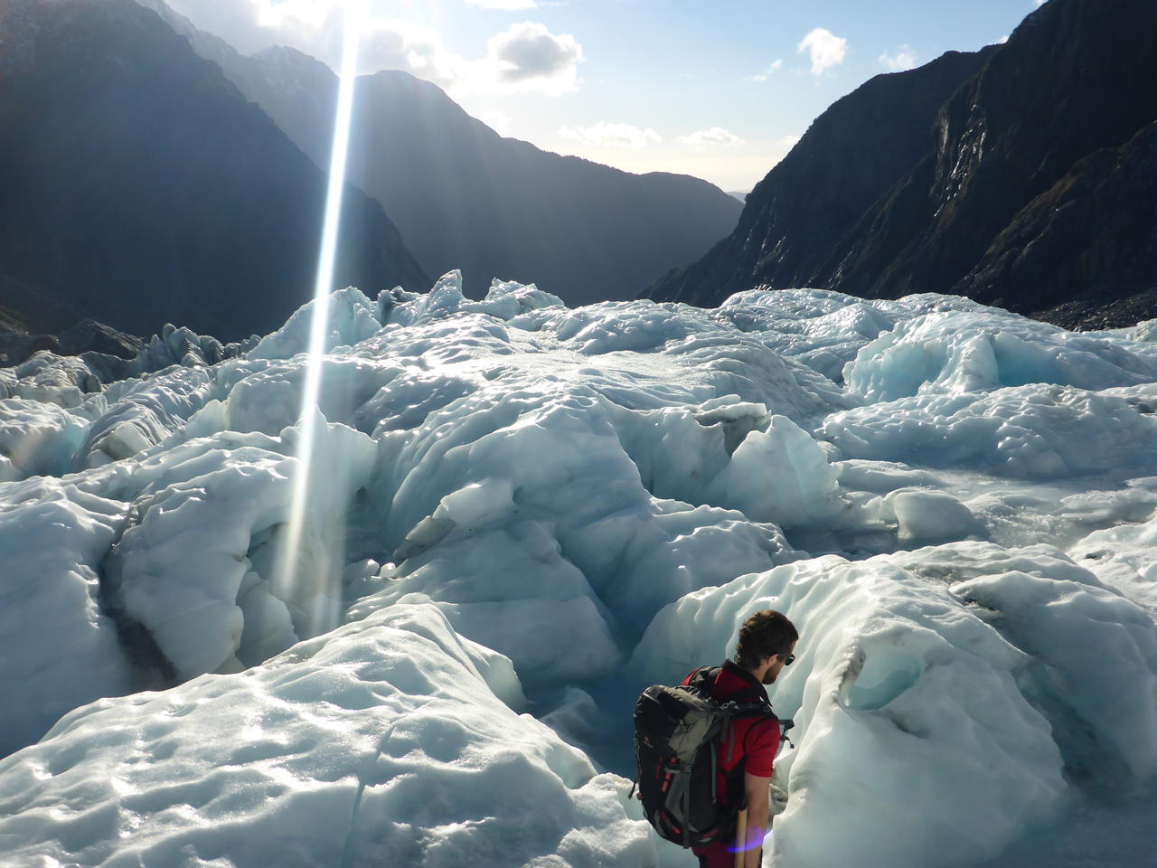 In der Gegend gibt es mehrere Gletscher, wobei der Franz Josef und der Fox Glacier die bekanntesten sind. Beide Gletscher befinden sich gerade in ihrem Abnehmezyklus, so dass eine Besteigung vom Tal aus aufgrund der abbrechenden Eisblöcke zu gefährlich ist. Allerdings gibt es die Möglichkeit mit dem Helikopter auf den Gletscher zu fliegen und dort dann an einer geführten Tour teilzunehmen. Dies haben wir aber leider erst unterwegs mitbekommen. Und natürlich auch in der I-Site, wo wir neben der Info, dass das Wetter am Folgetag ganz gut werden sollte, auch Material zu den verschiedenen Touranbietern bekamen. Allerdings ist der Spaß nicht ganz günstig Umgerechnet ca. 215€, für dass das wir eigentlich zuhause mehrere Gletscher vor der Türe haben (oder zumindest nicht weit entfernt ). Wir beschlossen uns erstmal ein Bild vor Ort zu machen und sind zum Franz Josef Glacier Lookout gelaufen. Vom Parkplatz aus ging es wieder durch dichten Regenwald, bis wir plötzlich vor einem großen Flussbett mit steilen Felswänden auf beiden Seiten standen. Hier befand sich bis vor ein paar Jahren noch der Gletscher. Bei starkem Regen kann sich der kleine Fluss aus Gletscherwasser, der sich durch das breite Flussbett schlängelt, innerhalb von wenigen Stunden zu einem reißenden Gewässer entwickeln, und den gekennzeichneten Weg, den man zuvor noch im Trockenen gelaufen ist findet man plötzlich nicht mehr, da man knietief im Wasser steht. Doch wir konnten problemlos weiter gehen. Durch die Wasserfälle, welche links und rechts von den Felswänden herunter plätscherten, und die verschiedenen riesigen Felsbrocken im Bett gab es immer etwas zusehen. Nach einem kurzen Anstieg befanden wir uns dann 250m vor dem Gletscher. Näher geht es ohne Guide nicht. Hier beschlossen wir dann auch, sollte das Wetter am nächsten Tag gut sein, den Heli-Hike zu machen. Weniger wegen der Aussicht, die schon super war, mehr weil wir den halben Tag mit Nichtstun verbracht hatten Als am nächsten Morgen also die Sonne schien und nahezu keine Wolken am Himmel zu sehen waren, ging es los. Nachdem wir mit Schuhen, Socken, Hosen und Jacken eingekleidet wurden ging es zum Helikopter Landeplatz. Nur wenigen Minuten später landeten wir schon auf dem Gletscher, wo unser Guide uns empfing. Es folgte eine kurze Einweisung wie wir unsere Steigeisen anlegen müssen und schon ging es los. Der Weg war zwar technisch und konditionell nicht anspruchsvoll, aber wir hatten tolle Aussichten auf den Gletscher und unser Tourguide erzählte viel zu der Gletscherentwicklung, was sehr interessant war. Zwischendurch gab es coole Abschnitte in denen wir uns beispielsweise an einem Seil durch eine Spalte hoch zogen oder durch metertiefe Spalten liefen, in denen das Eis richtig schön blau war. Immer wieder hörte man das Knacken durch das sich bewegende Eis und einmal konnten wir sogar beobachten wie ein großer Brocken abgebrochen ist und einige Meter nach unten kullerte. Scheinbar musste die Nacht zuvor auch ein Erdbeben gewesen sein, das sowohl unseren Guide, als auch die Dame an der Campingrezeption aufweckte, doch wir hatten wohl einen guten Schlaf...jedenfalls haben wir nichts mitbekommen Als wir dann mit dem Heli wieder zurück geflogen sind konnten wir noch ein paar schöne Blicke auf den Gletscher und die Umgebung erhaschen. Auf unserer Weiterfahrt zu unserem nächsten Ziel haben wir noch kurz am Fox Glacier angehalten und sind dort zu dem Lookout hoch gelaufen. Wie schon beim Franz Josef Gletscher ist das die Stelle, die einem ohne Guide am nächsten an den Gletscher heran bringt. Rechtzeitig zur Dämmerung waren wir oben, doch wir hatten nun ja schon unsere Gletschererfahrung gesammelt, so dass es bei Mondschein zurück zum Camper ging und damit auch zum nächsten Ziel...dem Milford Sound.