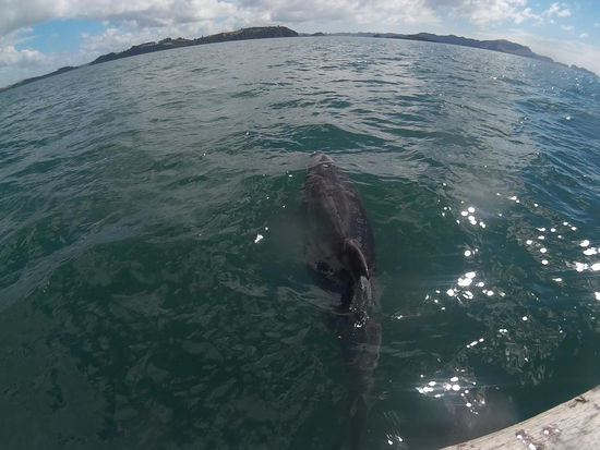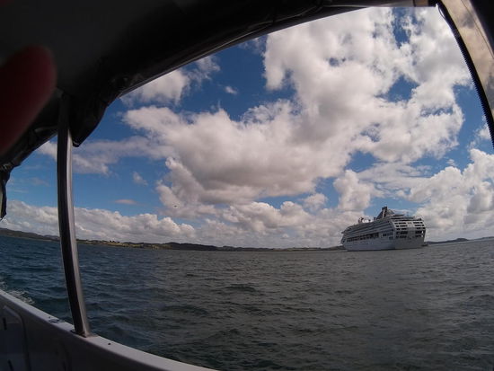 In einer kleinen Bucht ankern wir, um vom Wasser aus die Propeller, die durch Seetang verstopft sind, zu säubern. Das Boot hat keine normale Schraube, sondern Propeller, durch die Wasser angesaugt und abgestoßen wird, um weder Mensch noch Delphine im Wasser versehentlich verletzten zu können.
