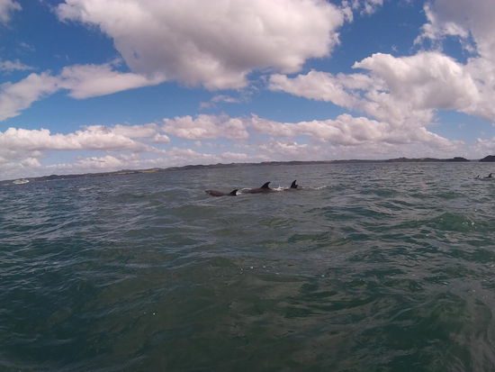 Ich sqeeke für ein Video, da ich mich an den "Dolphindance" erinnere, den sie mir auf Magnetic Island aufschwatzen wollten, um Delphine anzulocken. Und siehe da, plötzlich schwimmen drei von ihnen direkt neben mir an der Oberfläche. Ich habe das Gefühl, dass sie immen die Wasseroberfläche kommen, wenn ich sqeeke, vermutlich aus Neugier.