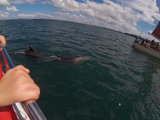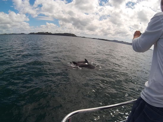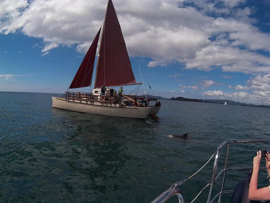 Sie sind größer als ich dachte. Die Gruppe entfernt sich wieder vom Boot und wir fahren neben ihnen her. Sie springen und spielen im Wasser. Immer wieder kommen sie zurück zu unserem Boot. Ein Segelboot taucht auf. Auch sie sind ganz begeistert von den Delphinen. Sie kommen wohl aus Fiji. Bula rufen sie herüber.