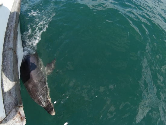 Wir finden relativ schnell eine Gruppe Delphine. Es ist unglaublich. Erst sieht man nur die Rücken und die Finnen, aber dann kommen sie ganz nah an das Boot heran. Schwimmen neben und unter dem Boot. Sie scheinen mit den Auslegern zu spielen, schwimmen unter und neben ihnen her. Wir hängen bäuchlings auf dem Deck an der Spitze des Bootes und können die Tiere fast berühren. Auch ihren Atem, den sie durch das Loch in ihrem Rücken blasen, können wir gut hören.