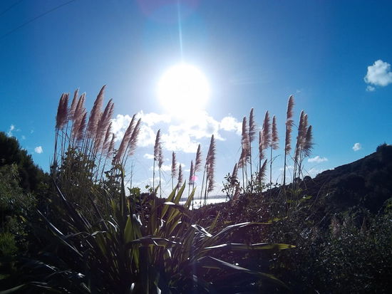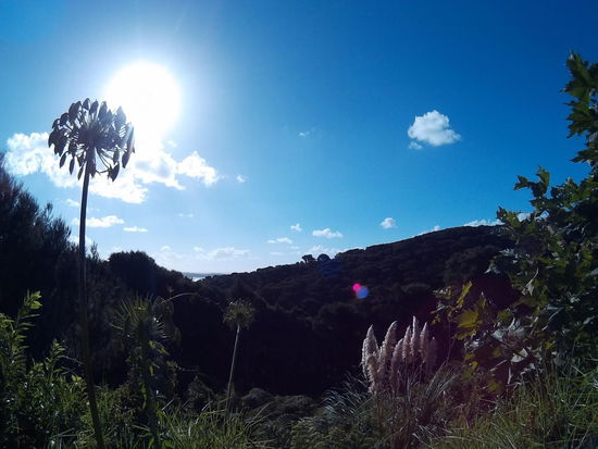 Der Weg endet wiederum an einer Straße. Hm, was jetzt? Weiter geradeaus gehen, schätze ich. Da vorne sind Schilder. Ah ja, der Strand ist links und der Flagstaff Hill ist rechts. Zum Gipfel sind es nur noch 5 Minuten. Ich biege auf den Weg ab und sehe wieder einen der braunen Vögel. Er verspeist grad eine Heuschrecke oder Grille. Ich mache Fotos und sogar ein Video, bevor er die Flucht ergreift. Awesome, beschwingt setze ich meinen Weg den Hügel hinauf fort und werde mit einer netten Aussicht belohnt.